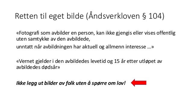 RA og i regionalforvaltningen. I den grad vi bruker bilder av deg på nettsiden, vil bildebruken være forankret også i ett av grunnlagene som følger av åndsverkloven § 104. Listen er laget med bakgrunn i åndsverkloven §§ 2 1, og 68. Det er den som har tatt bildet som har rettighetene til det, så spør før du.